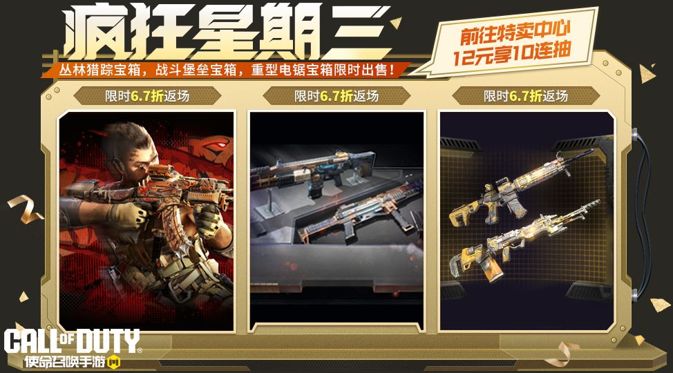 疯狂星期三活动期间,战士们将享受6.7折的超值福利优惠。本次返场的三个宝箱各拥有一次特惠十连抽体验,战士们前往“特卖中心”,花费12软妹币即可十连抽一次!