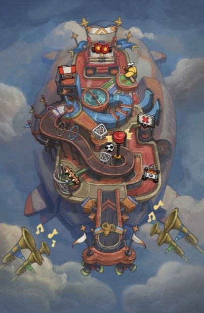 全新天空体育场地图更新,一座充满奇幻色彩的空中建筑,融合蒸汽朋克风格与游乐场元素,以蓝色天空为背景,搭配云朵、乐器等装饰,呈现出活力与创意的梦幻场景。