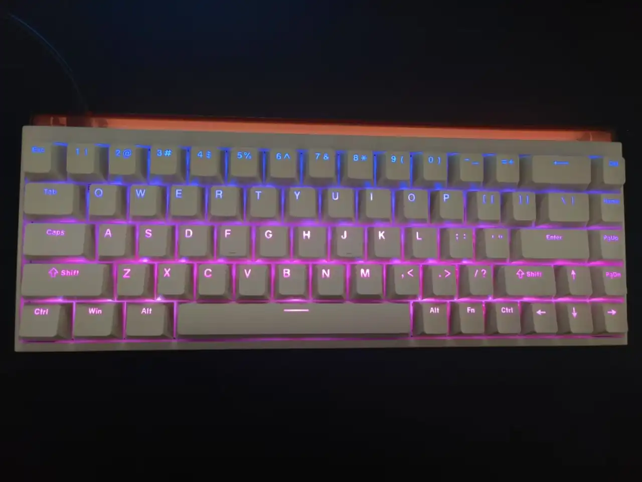在外观方面,这款键盘一共有尖石白、摩卡色、蜜桃色三种配色,颜值都非常高。键盘的整体比较紧凑,给人一种踏实的感觉。除了每一个键所对应的rgb灯光之外,在键盘的后面还专门加入了一个可DIY的灯箱,不过插线的方式是穿过灯箱进行连接,因此来回插拔多少有那么一点不方便,不过考虑到有线连接不需要经常插拔,倒不是什么特别影响体验的问题。