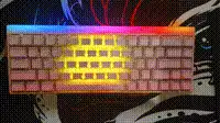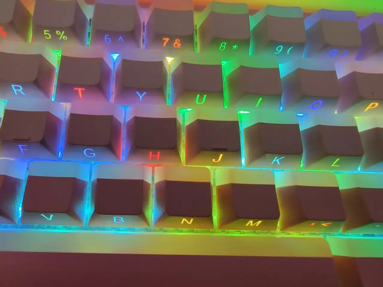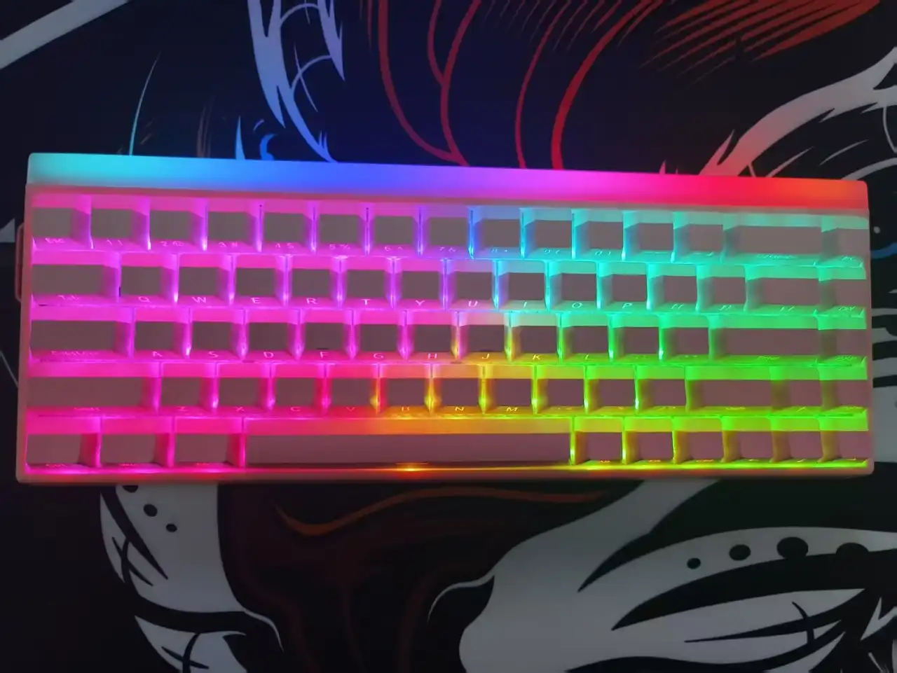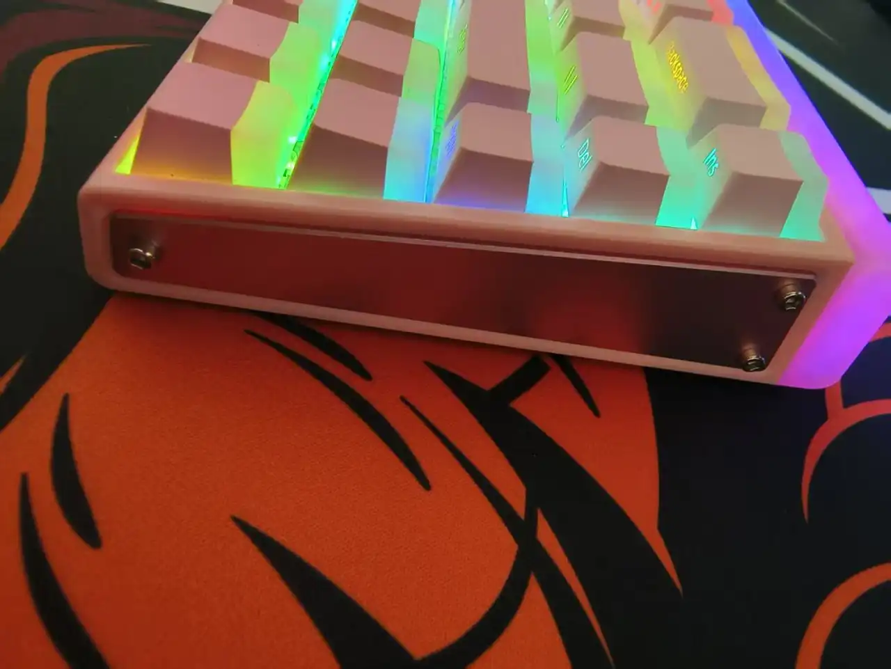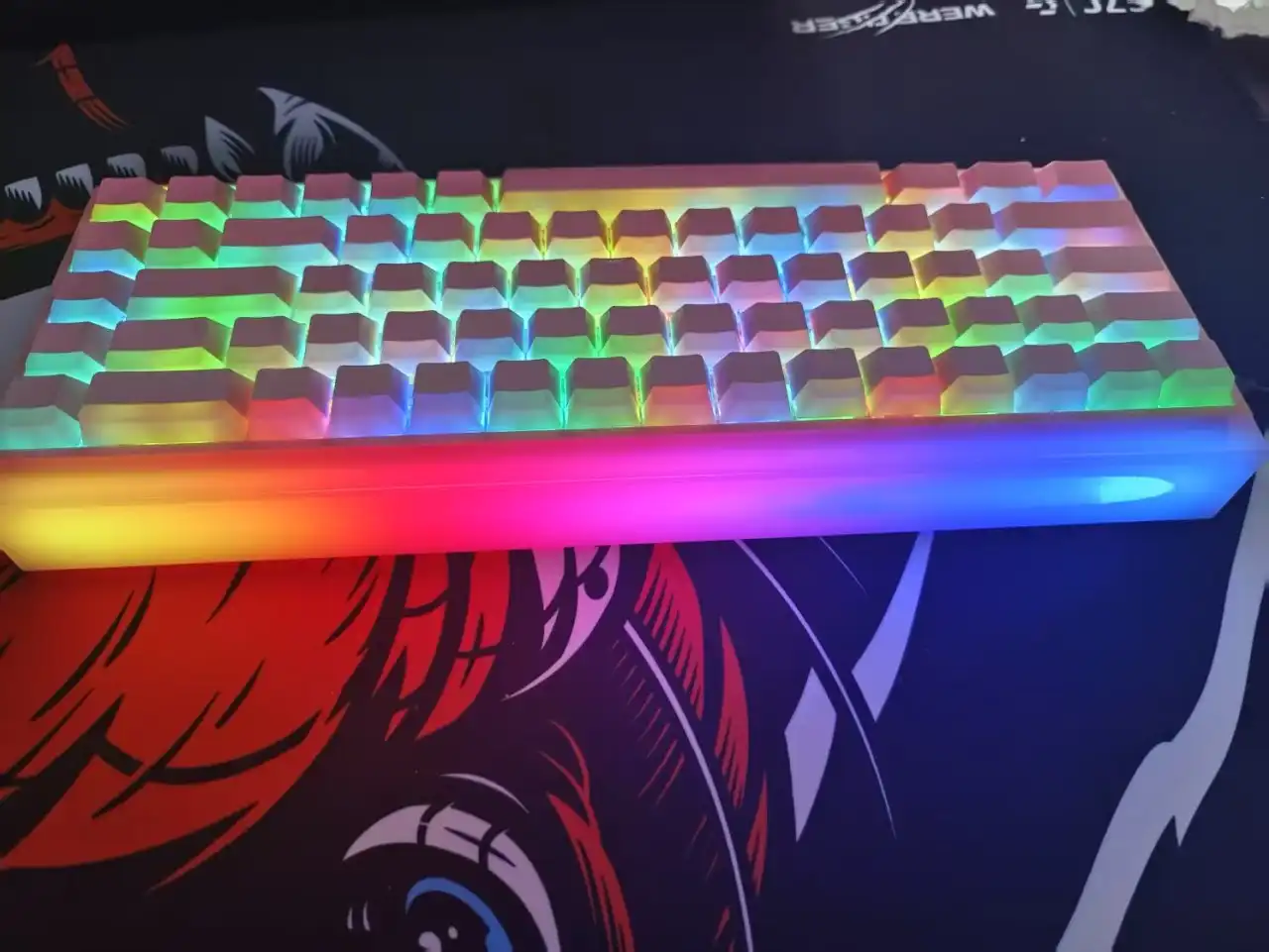 在外观方面,这款键盘整体配色为粉色,采用68键设计,键帽为粉白渐变灯塔键帽,作为一个猛男,这个配色我是真的爱。键盘在后部安置了一个幻彩灯箱,并且在两侧保留了铝合金定位板。其中键盘左侧还可以加飘带。整体颜值还是非常高的,尤其是搭配上键位的rgb灯效以及灯箱的灯效,能够给玩家们带来极致的视觉体验。