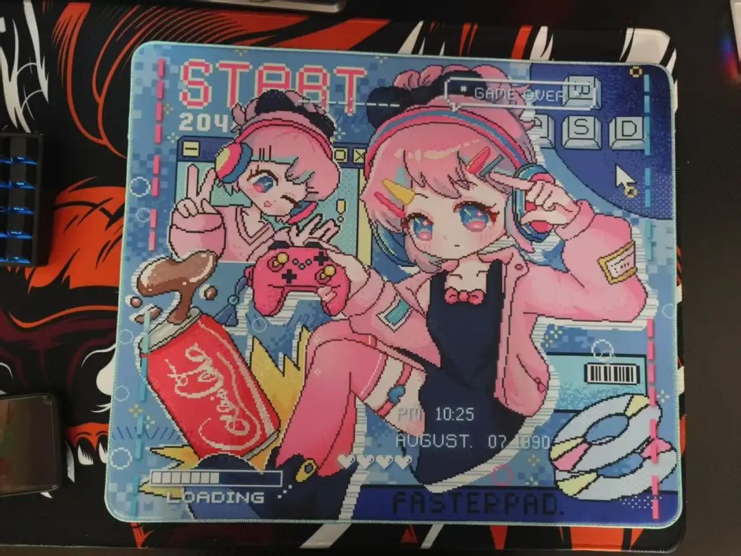 鼠标垫大小为450*400mm,属于市面上常见的大型鼠标垫尺寸,因此可以很好的满足各种需求的玩家。在颜值方面,这款鼠标垫儿自然无可挑剔,鼠标垫整体是一副二次元像素风美少女悠米图画。整体配色是蓝粉色赛博风格,有了电竞美少女的加持,枪法一定会更上一层楼的。