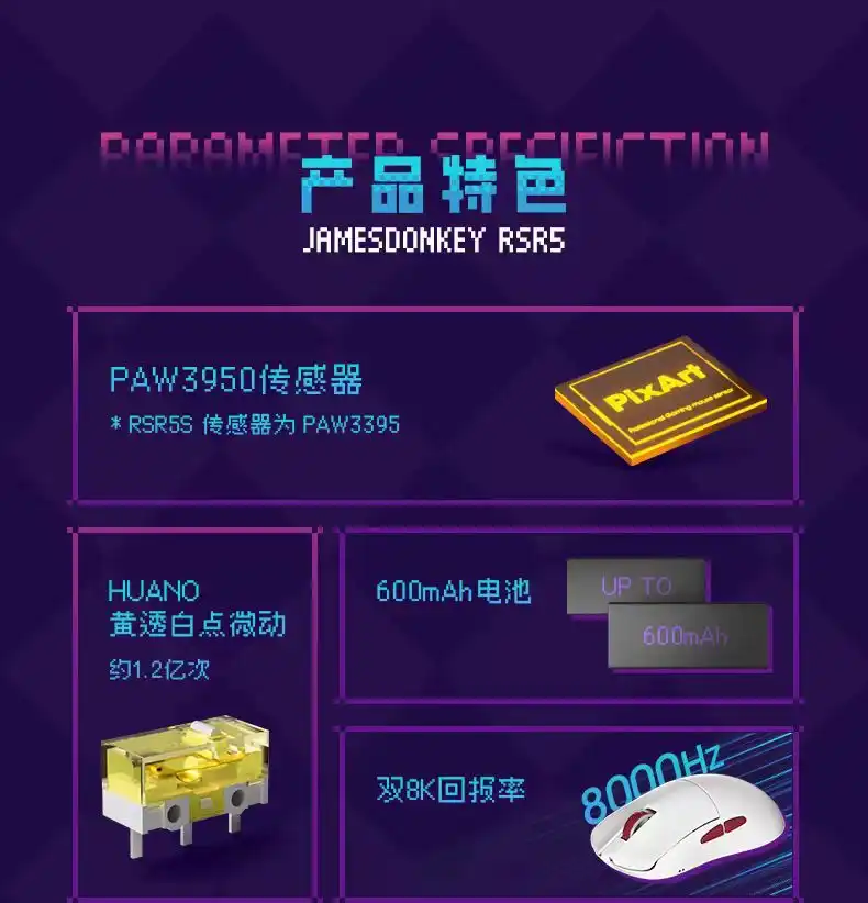 贱驴最新推出的rsr5可以说很好的诠释了这一点。省流:价格:3395/3950传感器 199/299双通道8k回报率像素风格 RSR5分别有价值199元的3395传感器和299元的3950传感器两大版本,考虑到性价比方面,笔者这次主要来介绍199元的版本。首先在外包装上,包装盒采用市面上常见的封套+天地盒设计,包装上无论是LOGO还是产品名称,都充满了像素风格。这位产品的风格做了铺垫。