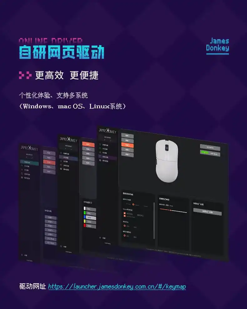 在没有驱动的情况下,玩家们可以通过鼠标的背键来调节鼠标的dpi和回报率,其中dpi五档,回报率六档,基本上可以满足大部分玩家们的需求。如果你想要自定义调节的话,那么就可以使用网页驱动。网页驱动非常简洁,并且支持多个系统。玩家们可以在驱动中自由调节灵敏度,回报率,宏设置等,整洁方便,诚意拉满。