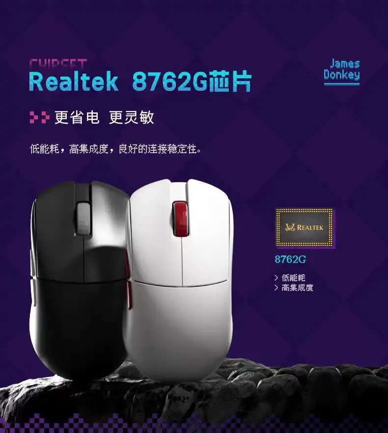 鼠标微动采用环诺黄透白点。键程较长,手感清脆,并且寿命高达了1.2亿次,非常适合MOBA类等需要经常按动鼠标的游戏。鼠标芯片采用Realtek 8762G芯片,这也让鼠标拥有低能耗,高集成度,良好的连接稳定性等优点。玩家们在游玩过程中不会出现鼠标漂移,卡顿等现象。