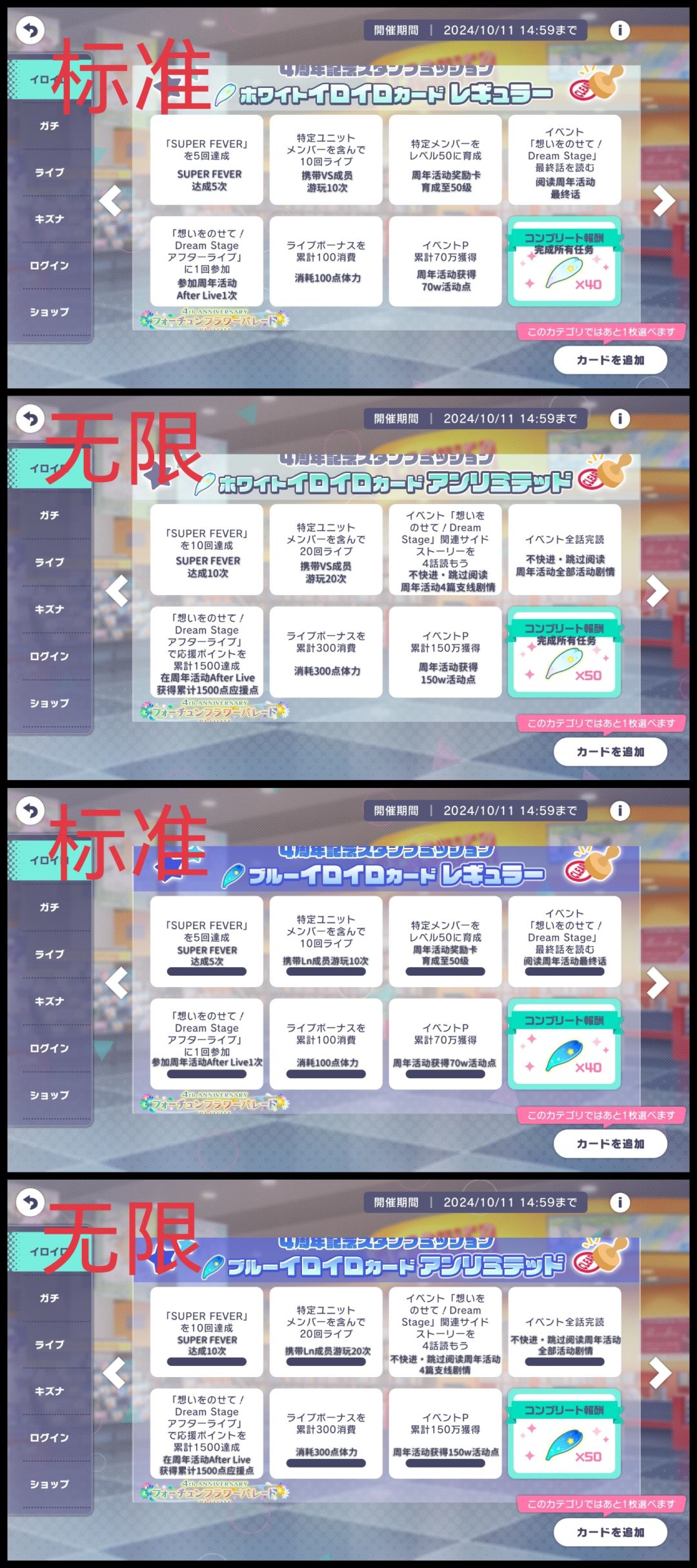 多姿多彩卡是建议大家一定要选的,这个给的花瓣是最多的;全力卡是只建议能打无限卡的大佬选的,标准是只建议没有时间登录的,但是歌力又很厉害的大佬选的,正常歌力打不了就可以选择登录卡的标准卡,他给的花瓣和全力卡标准卡是一样的。后面的大家自行选择就好了。