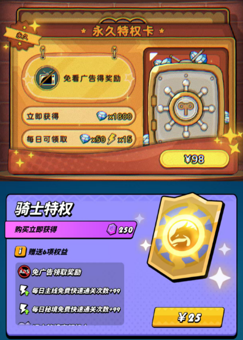 3、一般这种内购+广告的游戏,会有相当一部分玩家因为不想看广告选择购买免广告权益,所以这是一个重要的付费点。但官方把它捆绑成98元的高单价商品,要知道《飞吧龙骑士》中去广告的价格只有25元。