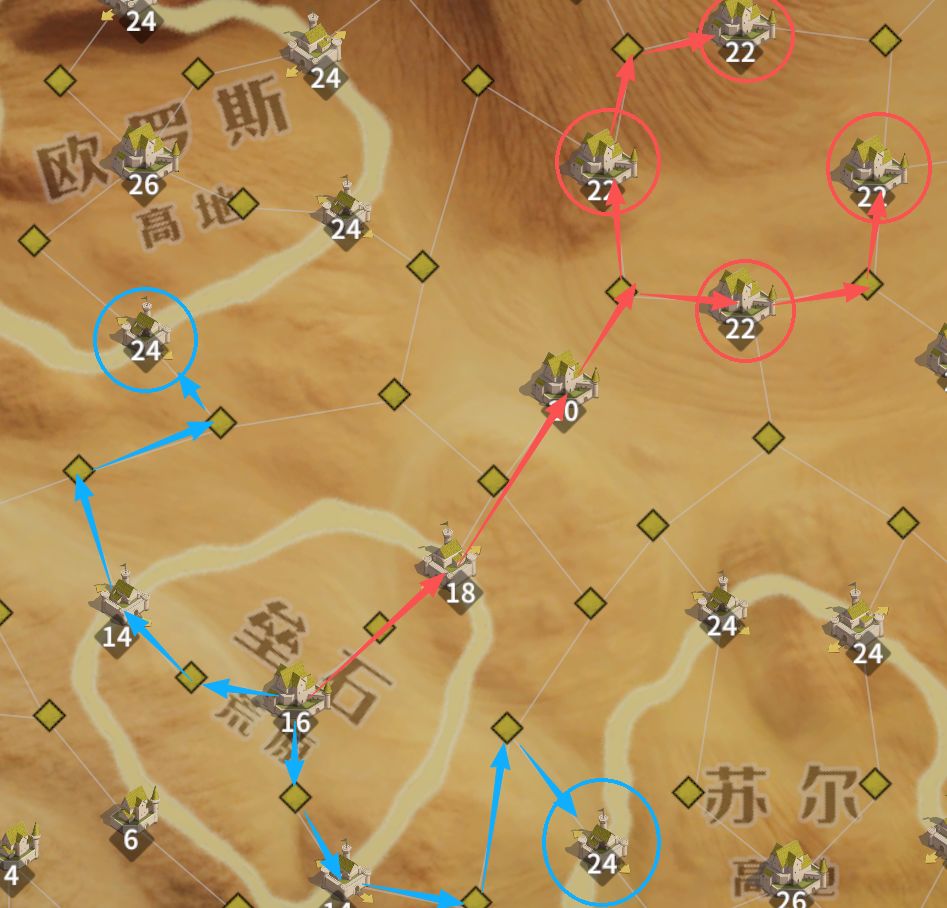战略建议:达成第三阶段后,从自身控制的16级城出发,争夺中心区域的22级城(红色路线),并尽可能控制通往最终3级区域的关隘(蓝色)。