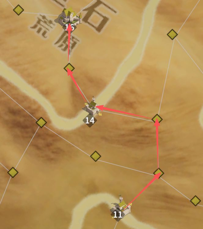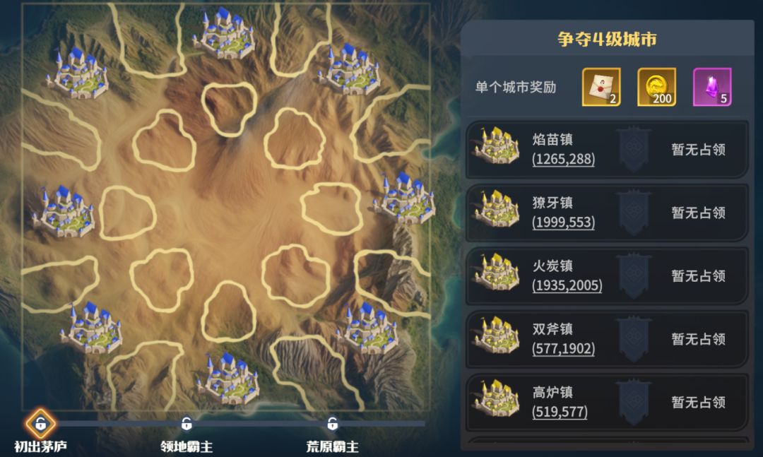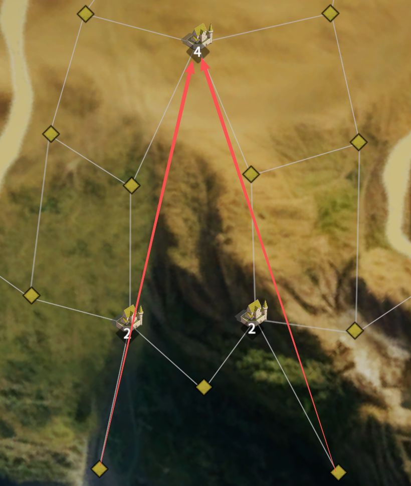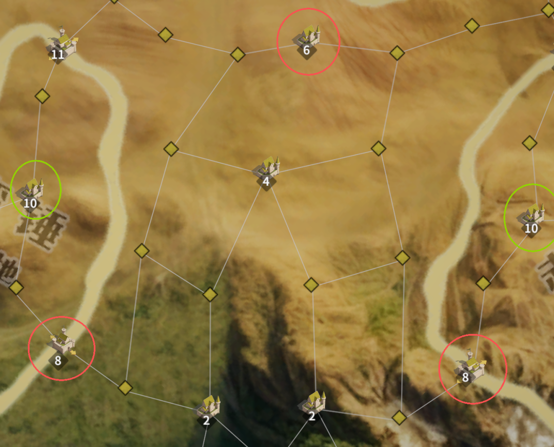 战略建议:争夺6级城镇,以及8级关隘,打通去向10级城的路线,最终争夺有希望夺取的10级城。