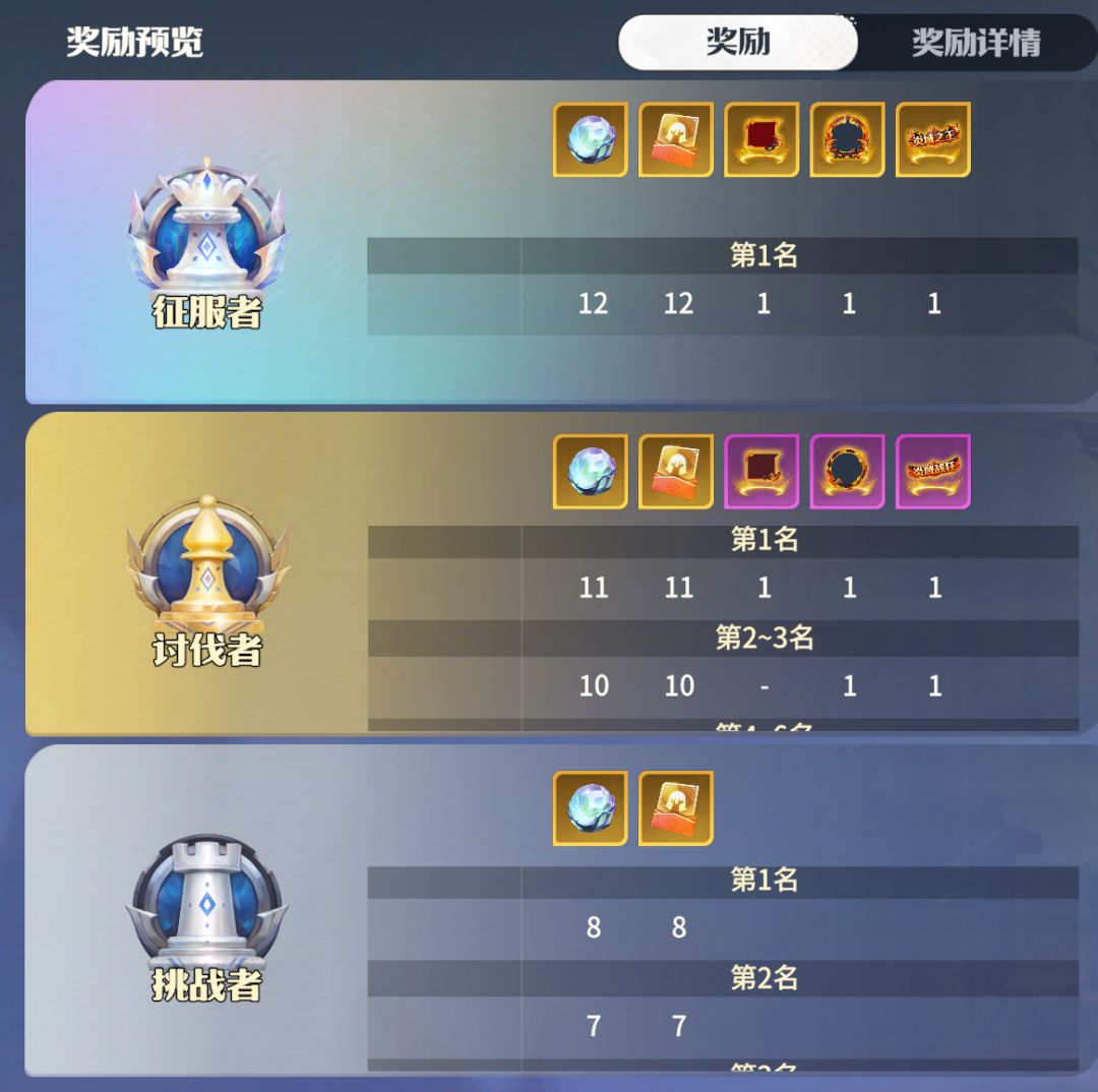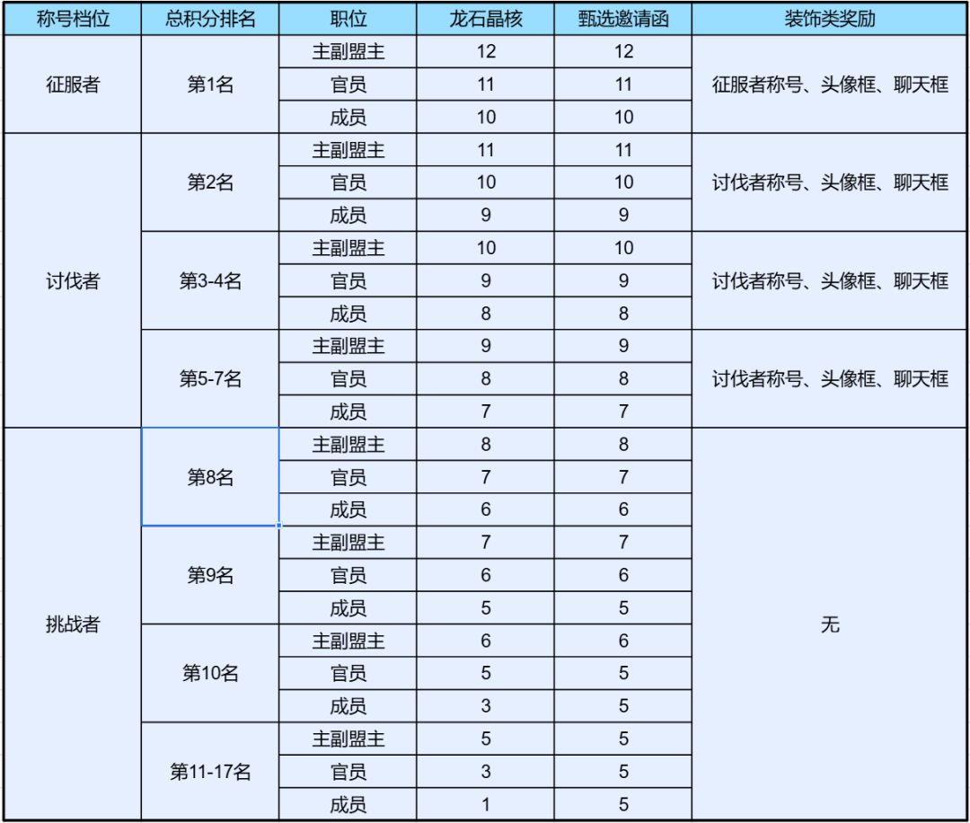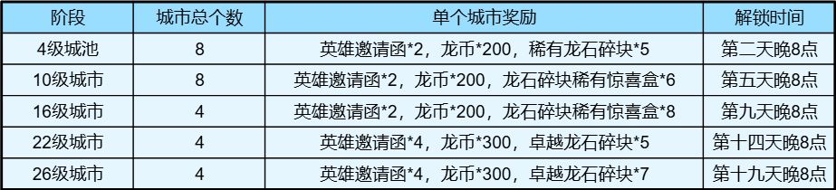 最终奖励,不再用王城和卫城来结算奖励,而采用积分制,根据名次进行奖励。其具体如下图: