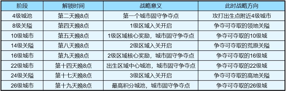 同理用表格给出具体的单个奖励、个数、解锁时间等。各位联盟管理可在相关的开启时间展开对应争夺,最终守住结算奖励即可。