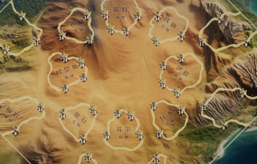 领地:1级区域,有关隘隔绝,中心为10级城,一共8个,供8个出生点争夺。