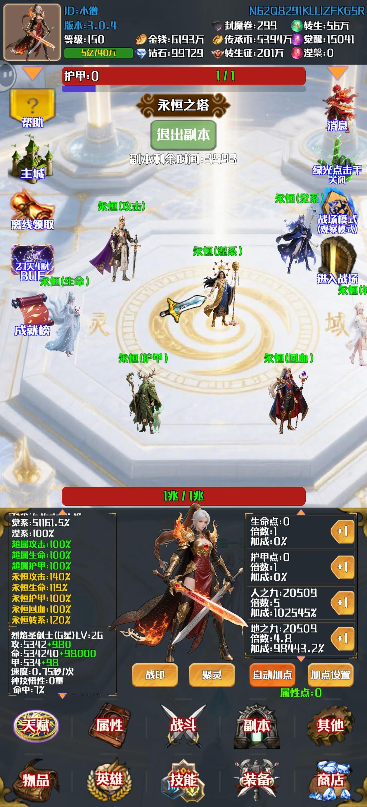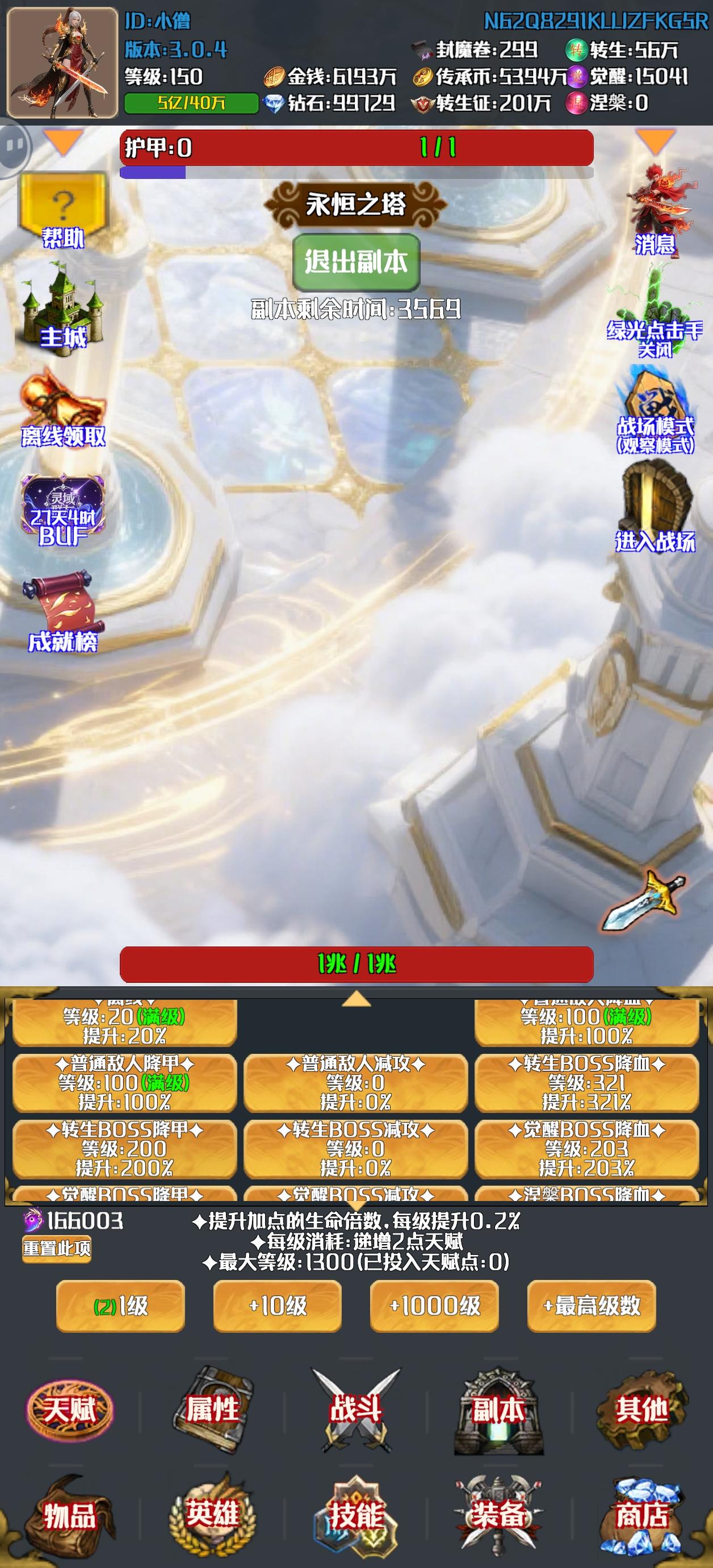 可以打相应的怪物,从而获取对应的属性加成。建议只需要打永恒攻击,转系觉系涅系即可,先后顺序为攻击,转系,觉系,其他不需要。在观察模式中,可以切换层数,一层每次击败加百分之一,可以兑换一点永恒点,二层每次加百分之二。在下方,可以用永恒攻击等兑换相应的永恒点,也可以用钻石买打永恒的次数。永恒点可以兑换装备保护卷,宝物,天器,皮肤等,建议兑换优先级觉醒+1>天子剑>梦幻剑>皮肤。(天子剑限购两把,第一把转生+1,第二把觉醒+1,梦幻限购三把,每把可转生+1,可叠加)。
