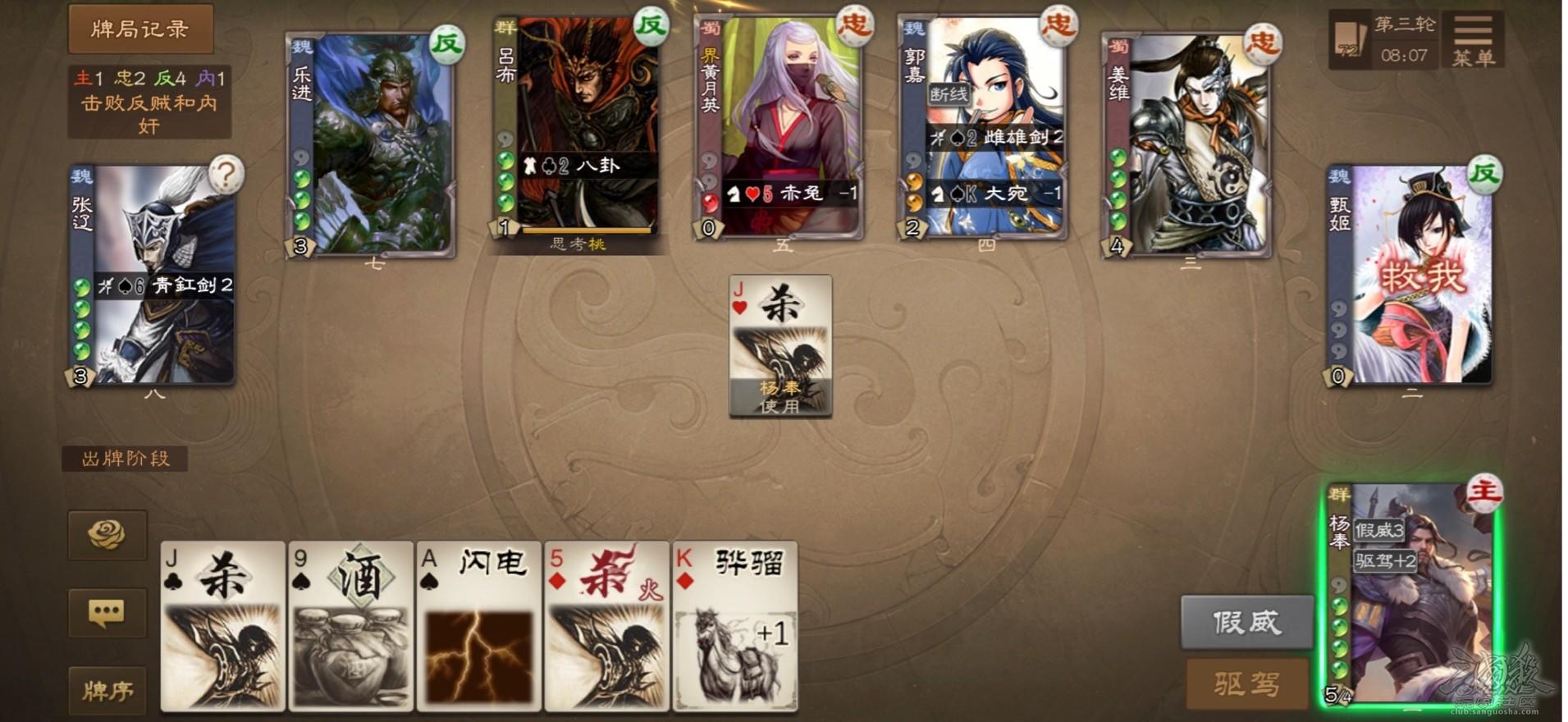 由于是主公,我可以发育到弃5摸6的状态,于是抓住机会打了一波击杀滚雪球。但是有一回合因为没计算好伤害,丢掉了二技能。