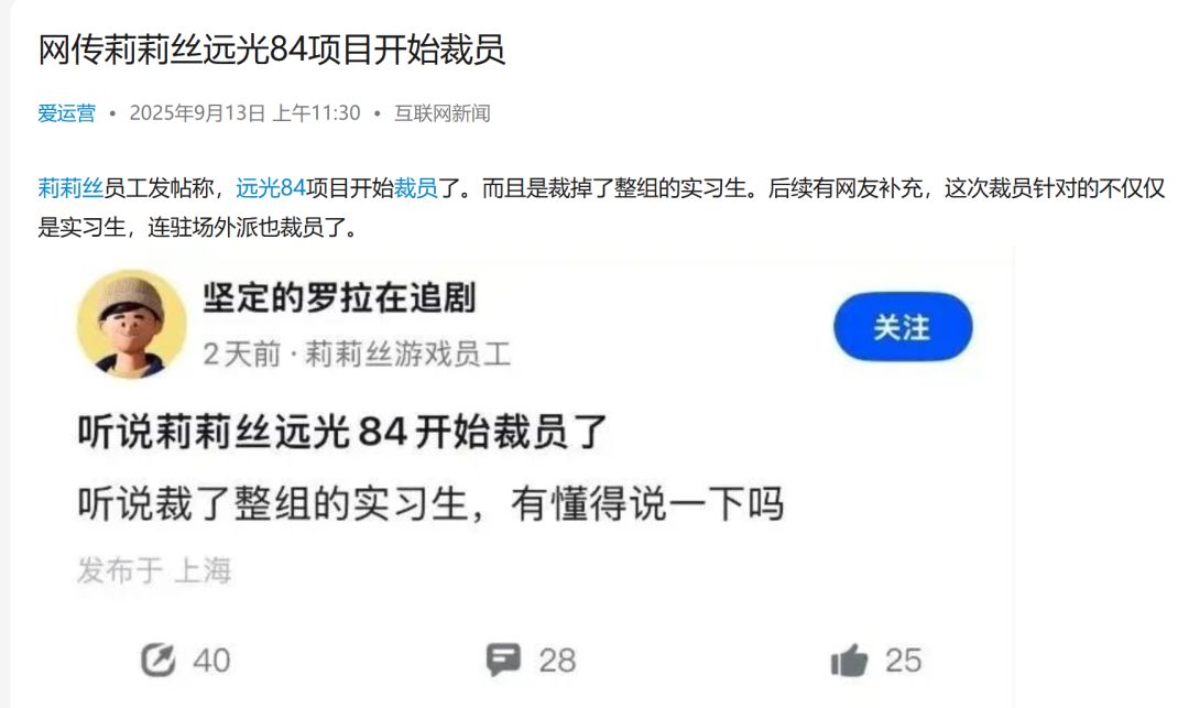 莉莉丝员工发帖称,项目开始裁员,而且是裁掉了整组的实习生;