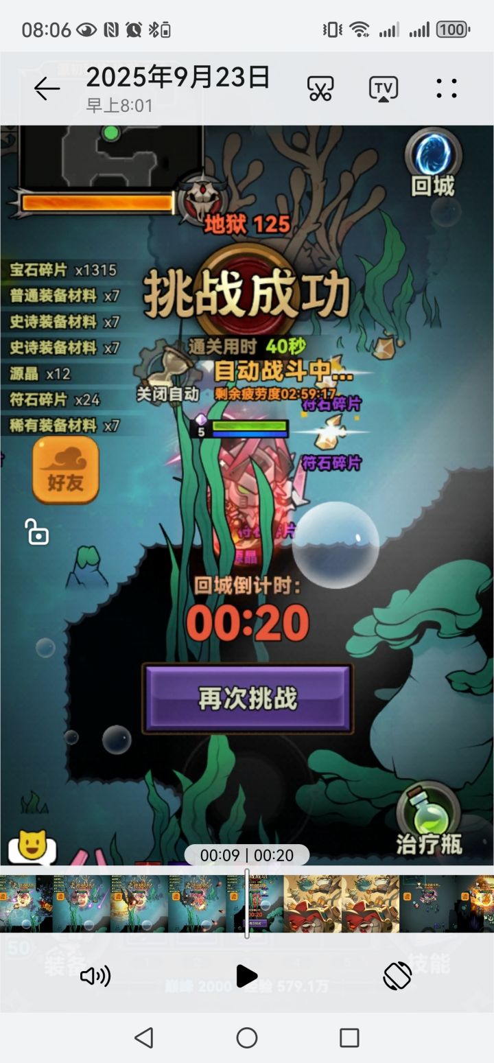 今天自动挂的第一把,打完最后左上角有时间的一帧是2分19,也就是40或41秒,但疲劳已经扣完了是还剩2小时59分17秒,最后挑战成功也是40秒