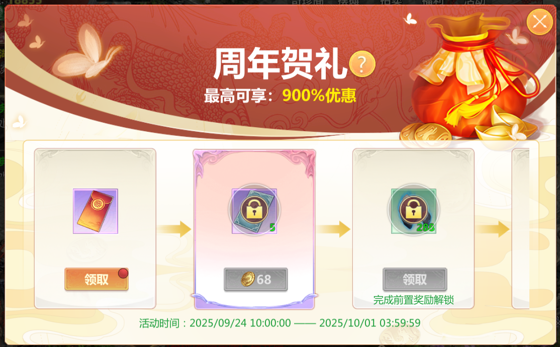 四、周年贺礼活动时间:9月24日10:00~10月1日03:59活动范围:全区全服游戏内新增周年贺礼商店,活动期间完成当前礼包的相应任务可解锁购买“周年贺礼”,购买前一个“周年贺礼”后可解锁下一个“周年贺礼”的领取条件。