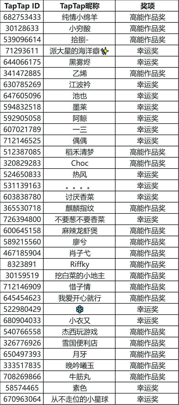 恭喜以上35位殿下获奖,平台将在公示期结束后的10个工作日通过站内信收集获奖用户的收件信息~
