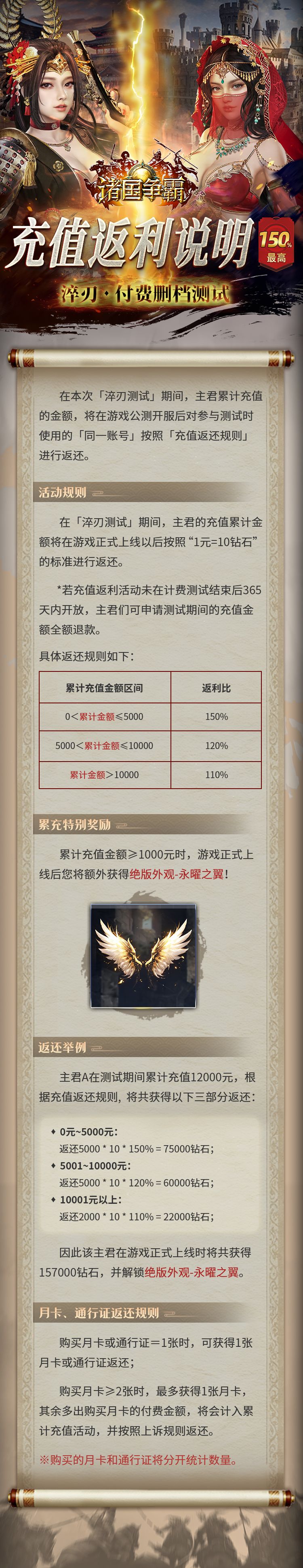 2. 主君可通过游戏内相关充值返利活动界面领取返还的钻石及期间购买的月卡、通行证;