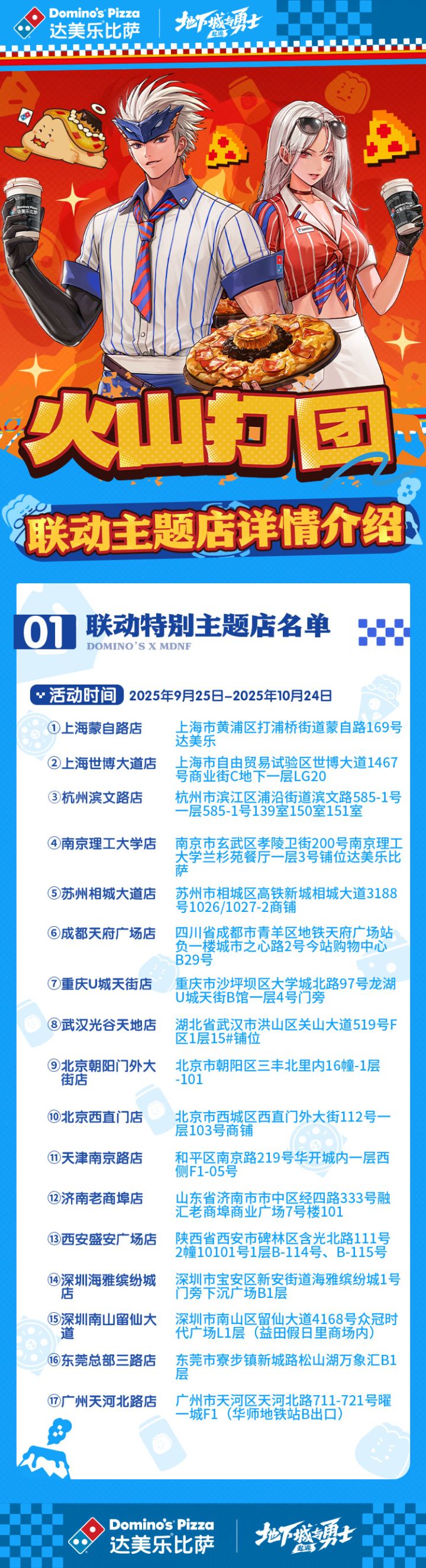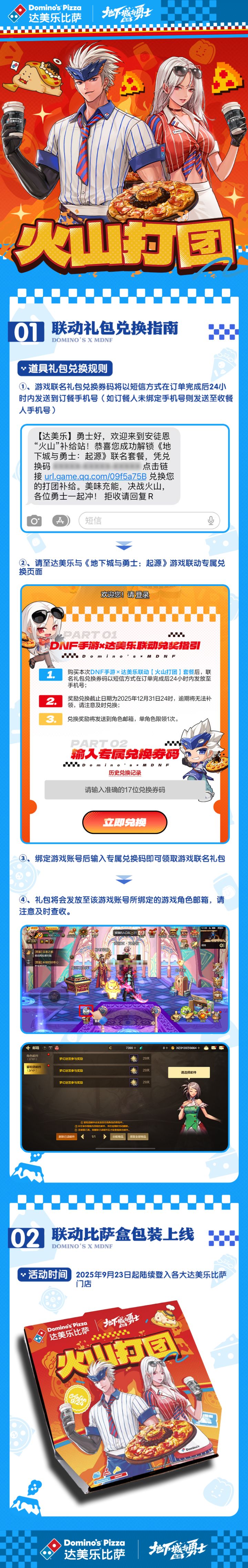 火山地貌神还原,争做舌尖探险家!DNF手游×达美乐比萨梦幻联动即将来袭!可可“火山”比萨丝滑浓郁,口感丰富,直击味蕾!9月25日至12月24日,共50000套联动套餐全国发售!购买即赠联动支架立牌、游戏内安徒妮宠物礼盒!9月25日至10月24日,更有上海、杭州、南京、苏州、成都等14城17家“火山补给站”联名主题店重磅亮相!“食”力爆发,勇士齐聚,共赴“火山”探险!![[表情_期待]](https://img-tc.tapimg.com/market/images/d26b9c5d2d83fec7f865b827ab8bf3ac.png)