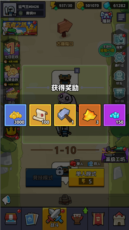值得一提的是,单人爬塔玩法与合作模式近似,同样是在3x6的格子上通过召唤合成英雄,抵御怪物的入侵,直至回合结束取得胜利;