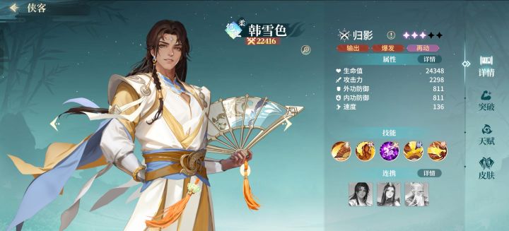 核心阵容:韩雪色、黄樱、秀棉、上官婉儿,再搭配一名高星侠客。重点培养韩雪色和秀棉至绝世5星即可。