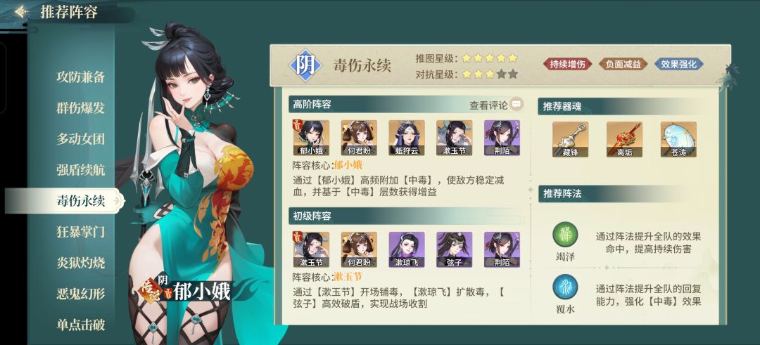 阵容优势:保C打法,所有资源给郁小娥,配合上官开局两个大刷伤害且挂毒,其他角色为其服务,起到一个站得住且输出高的作用。