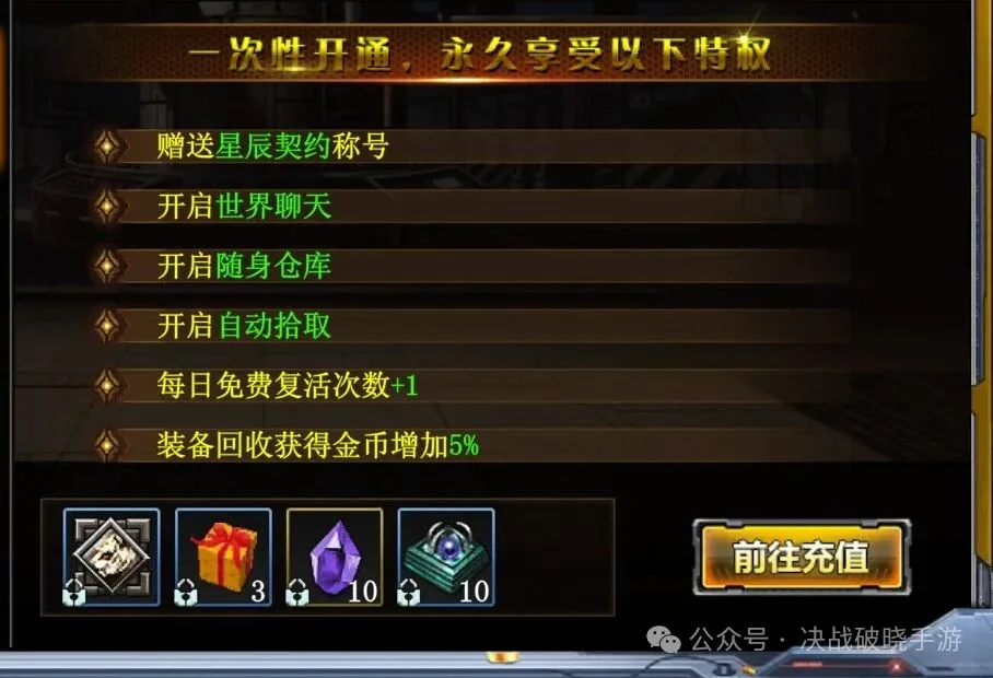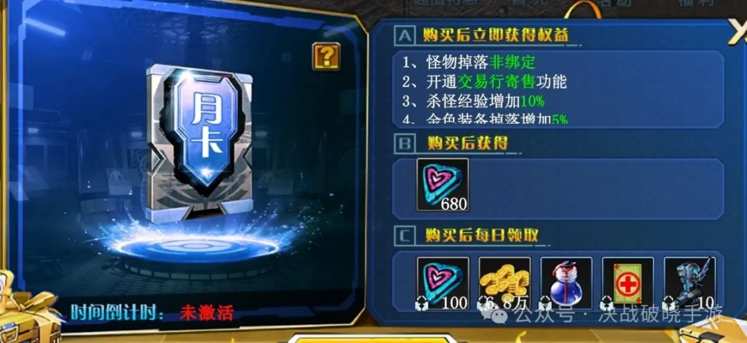 想在这游戏里搬砖得先买“门票”——68米月卡。解锁后所有打怪掉落装备道具变为非绑定,同时开启交易行功能。月卡还额外赠送杀怪经验加成和金色装备爆率提升。