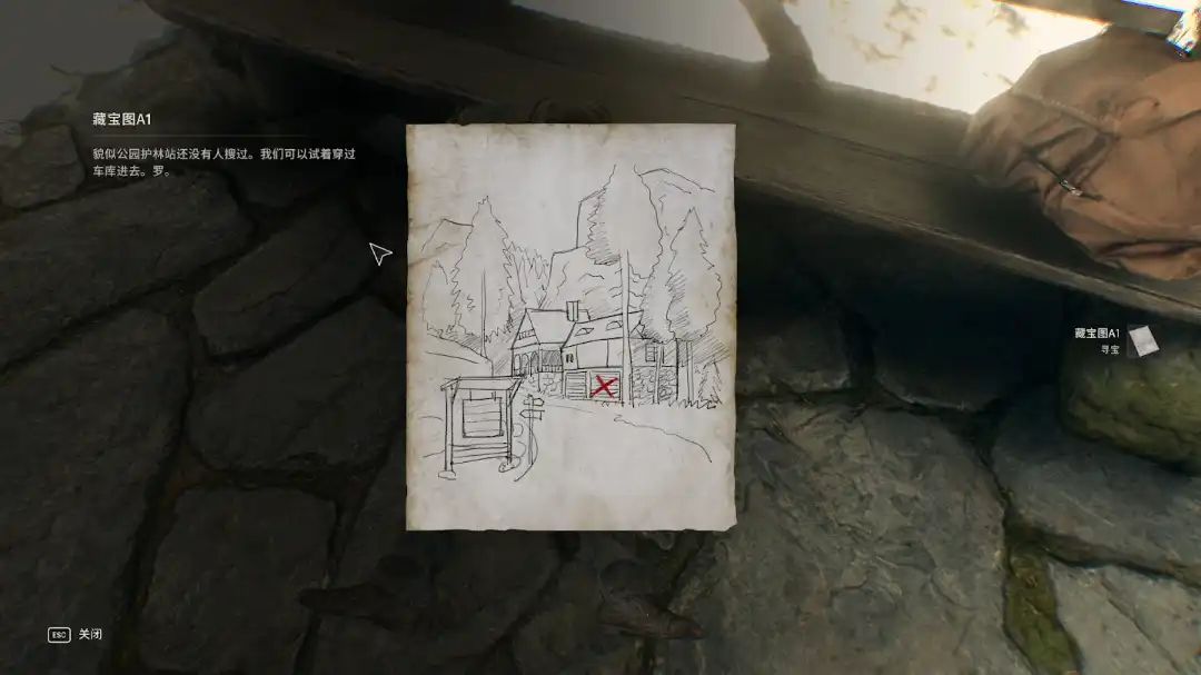 来到这里之后会发现有一个倒着的兄弟,手边有一份【藏宝图A1】地点显示在一个车库中。