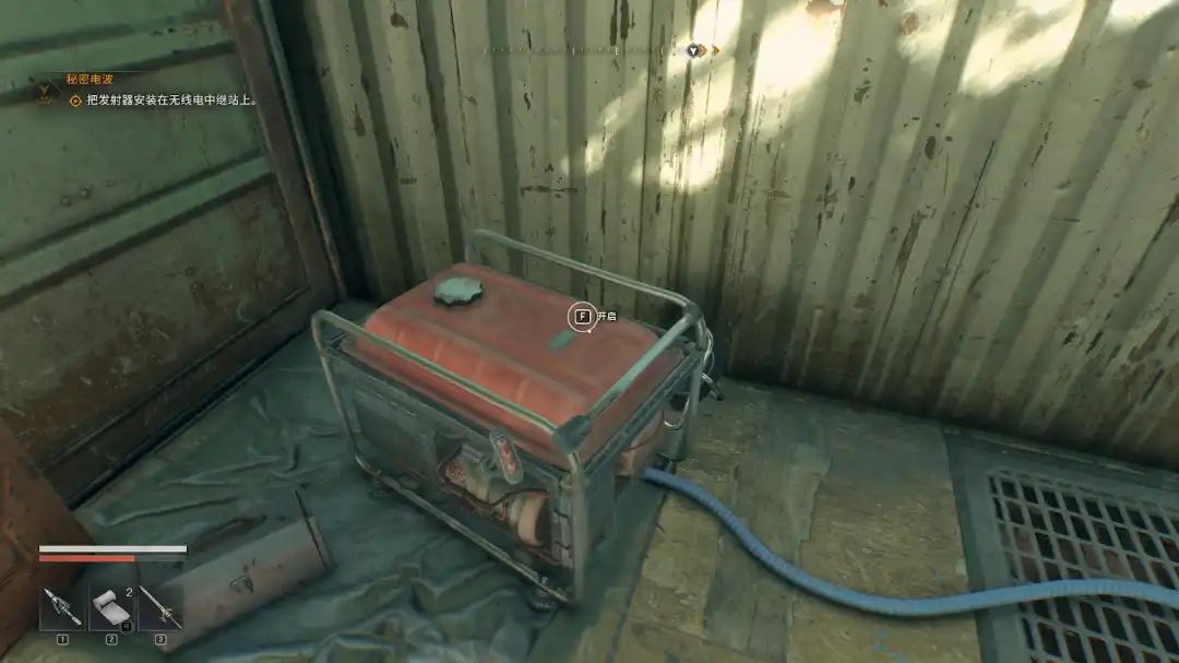 进去之后开启发电机,再把线缆拽出来,连接到车库门右边的墙上。