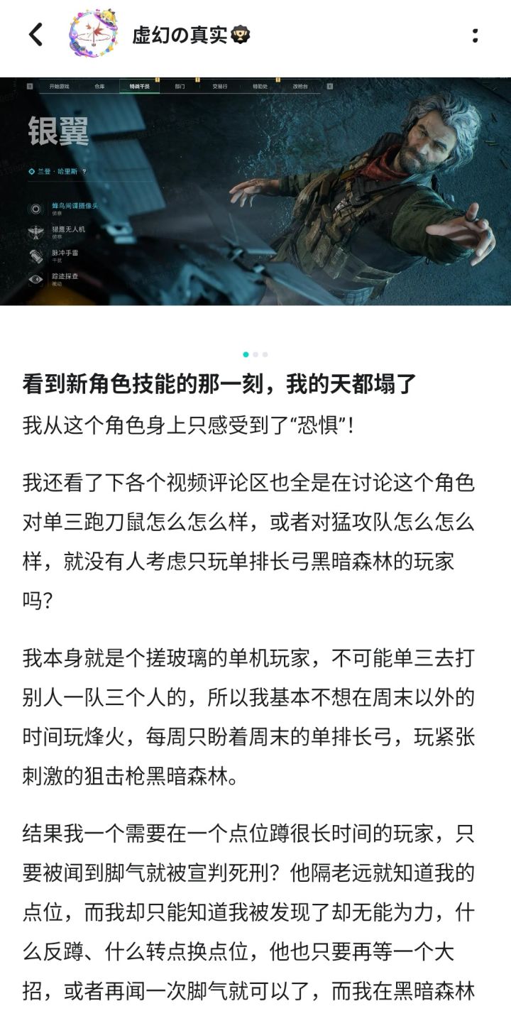 我之前发了一篇关于“银翼毁了单人模式”的文章,主要结论是“体验服的银翼展现出的信息获取性能太过逆天,以至于跑刀仔、老6等鼠鼠玩家无处遁形”。