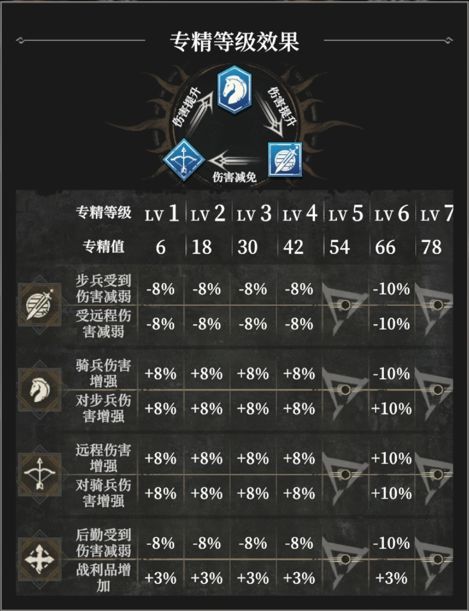 当某一专精达到5级和7级时将额外触发专精技能,每个兵种的专精技能都会有所不同。