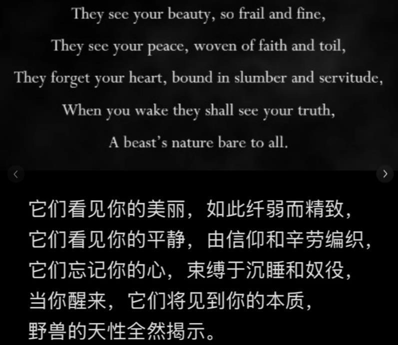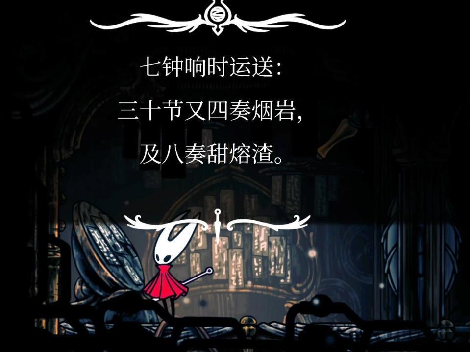 “七钟响时运送:三十节又四奏烟岩,及八奏甜熔渣。”这句就很经典,完全让人摸不着头脑,看着以为是什么解密句子。Ai翻译是:“第七声钟响时,请献上: 三十份烟岩鱼(四拍节奏), 八份甜香鱼(附忠诚印记)——全体工匠敬呈。”黑盒玩家的分析“虽然不是机翻,但肯定不是什么好翻译英文原文用的toll和fealty应该是属于比较小众而且文雅的词(平常的bell用ring就好了),虽然说measure和beat大概是做节拍和小节的意思。整个文段结合地图背景应该是工人劳动时喊的号子?”“大概是:(领)七声钟响——(合)嘿嚯!(领)烟岩三十——(合)四拍落!(领)甜熔岩八——(合)八拍进!(领)忠诚印鉴——(合)众工同心!现在的翻译组不接没翻译出原本的话,甚至看不出是整段文字想表达什么意思。”
