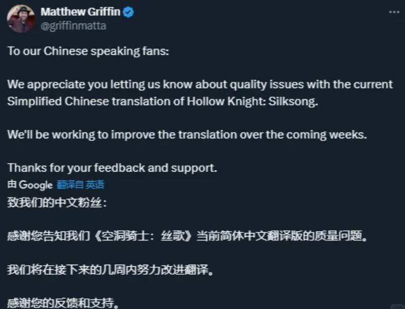后续大量中国玩家通过Steam评测、社交媒体等渠道发声,要求Team Cherry尽快修复中文翻译问题。目前《丝之歌》官方已发表声明,表示“已收到反馈,将在接下来几周努力改进简中翻译质量”。剧情党和对游戏质量有要求的还是等一阵子吧。