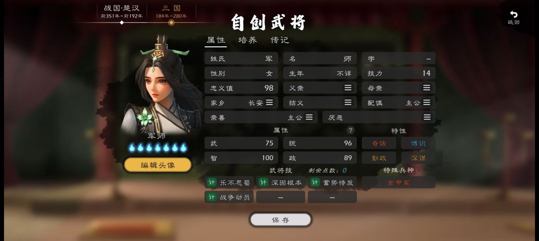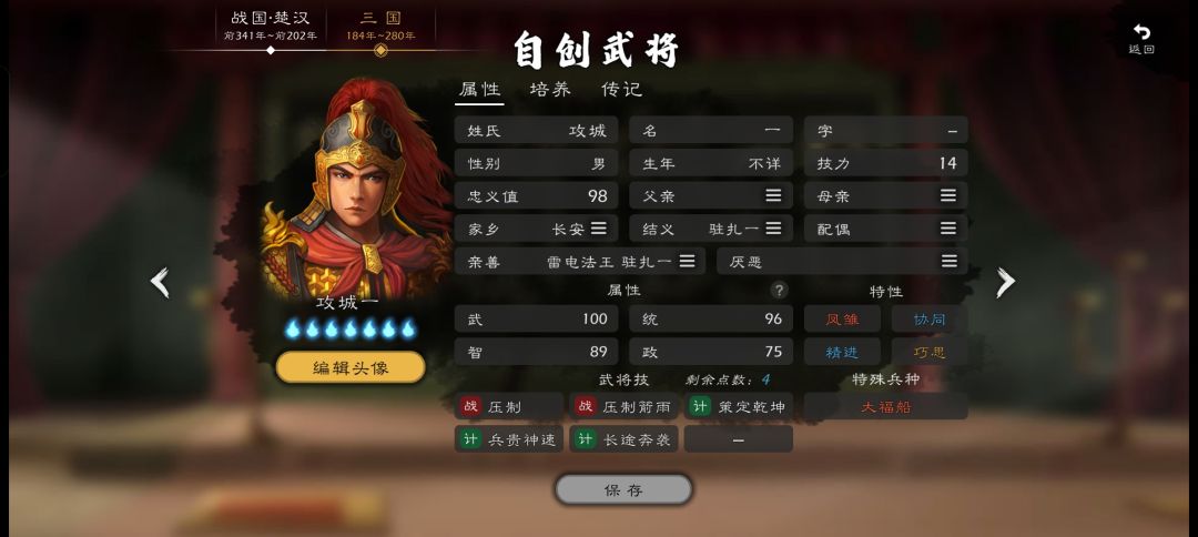 两战法对城内兵力造成高伤,且降低城反击,特性【协同】还能配合天赋【支援】,技能【策定乾坤】有特性高额增幅,还有俩赶路计策。