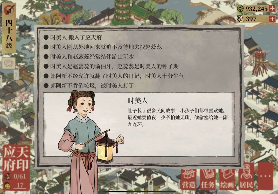 这道题目吓到我了😂我还真没特别关注过居民,后来我想起来一个“时美人”还是挺好听的。顺便把两个号做了人口统计,应天苏州还好摆的都是团在一块,到杭州😂放飞摆的散落各处就难找。微风:特殊45,普通169;星海:特殊40,普通160。(还有4个没买坟墓😂)一下感觉自己是两省6市总督一把手😂后面再开城合起来得小千号人口,不得了。