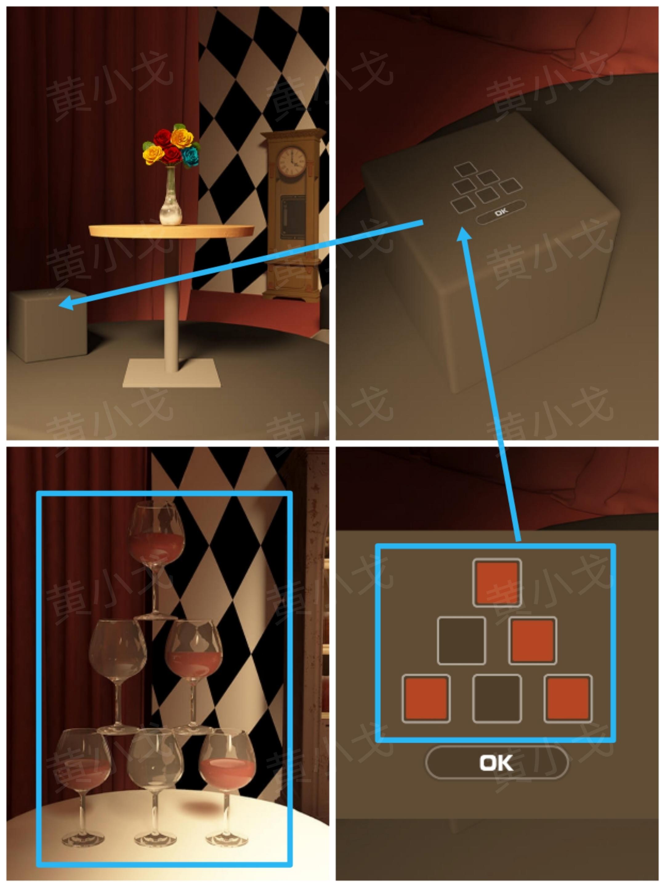 11.点击桌子旁边的箱子上的密码锁,根据[书架]场景酒杯中的液体位置,调整密码锁