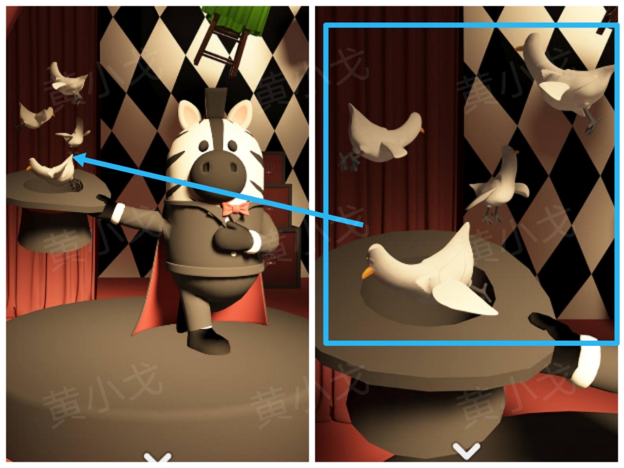 17.点击圆桌暗格上的密码锁,根据[帐篷]场景魔术帽中鸽子的位置线索,调整密码锁