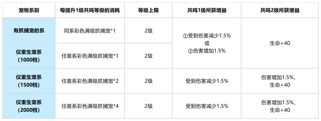 共鸣系统:通过消耗1转140级抓捕彩宠提升所属系的共鸣等级,使得该系所有宠物同时获得永久属性增益。
