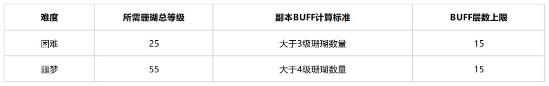 ● 同时,【勇闯珊瑚海】困难与噩梦难度新增个人增益—珊瑚之歌,当背包和宠物身上的等级最高的20个珊瑚总等级达到一定条件后,每有一个3级/4级珊瑚,在困难/噩梦珊瑚副本中可以获得1层珊瑚之歌buff,最高可获得15层。