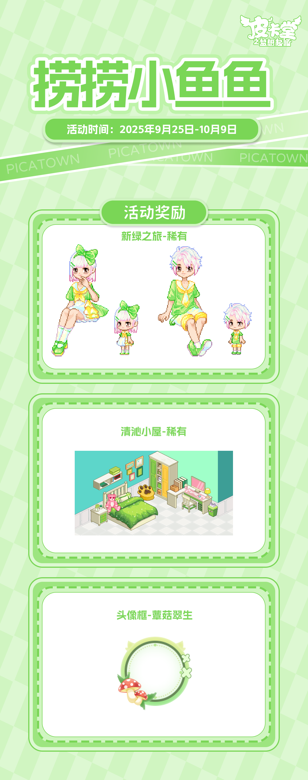 -【捞捞小鱼鱼】活动限时上线!参与将有机会获得套系家具「清沁小屋」、稀有套装「新绿之旅」、头像框「蕈菇翠生」!