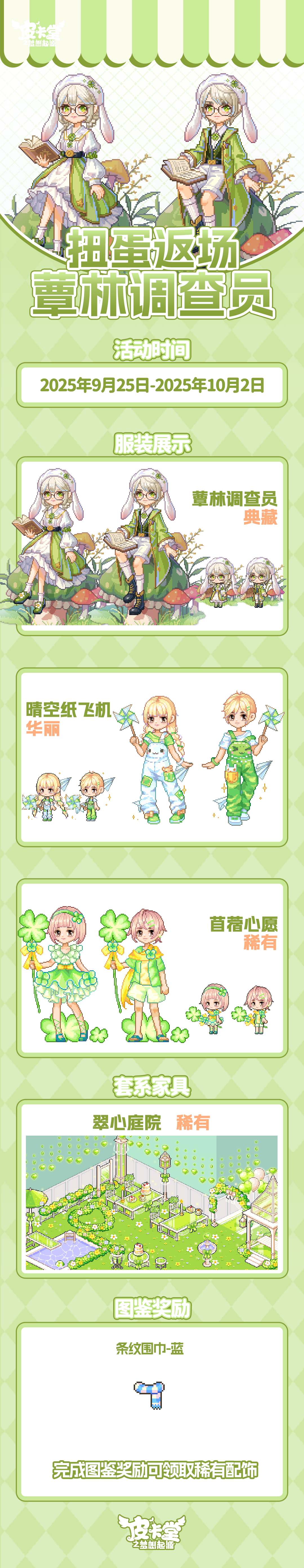 -【限时金币扭蛋】返场!可使用限时扭蛋券/金币抽取,参与可获得典藏套装「蕈林调查员」、华丽套装「晴空纸飞机」、稀有套装「苜蓿心愿」,套系家具「翠心庭院」!完成图鉴收集任务可获得配饰「条纹围巾-蓝」!