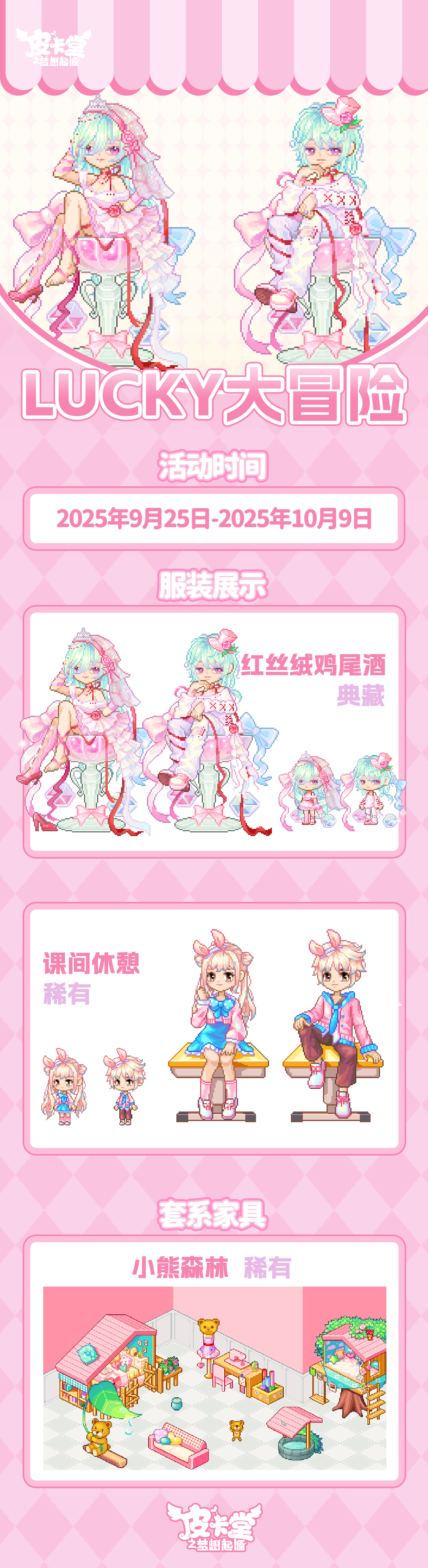 -【LUCKY大冒险】上新典藏套装「红丝绒鸡尾酒」、稀有套装「课间休憩」,套系家具「小熊森林」!