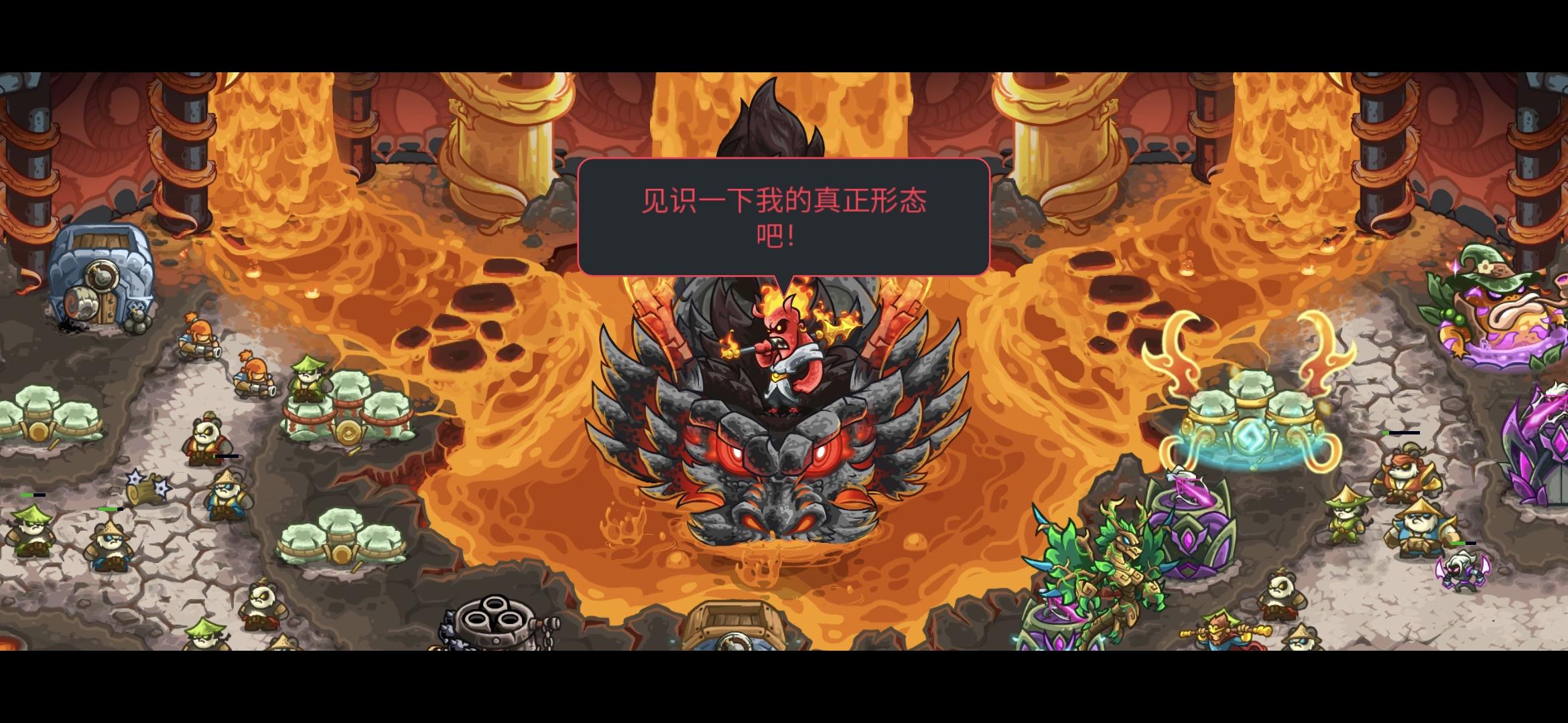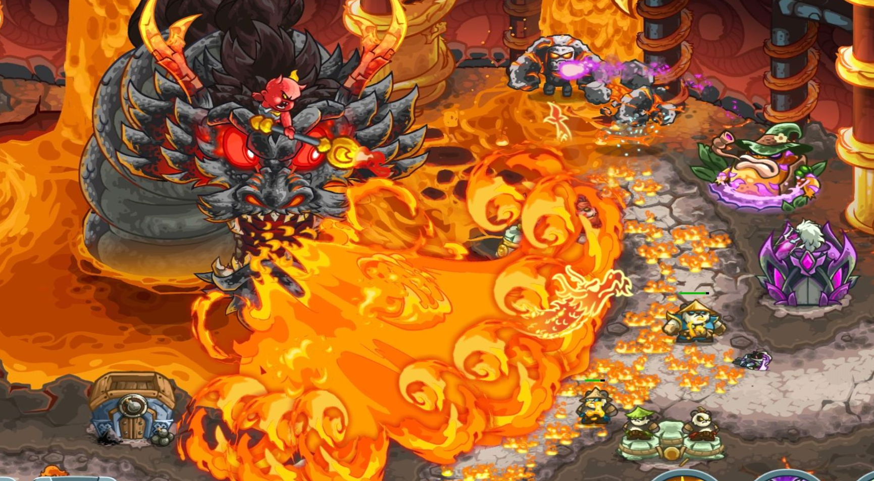 首先指挥官就会遇到红孩儿以及一头巨龙在地图中央虎视眈眈,随时准备放火球焚烧友军,用烈火封印我方防御塔,即使是在等待期间,焰火仍将降临路径之上。而本关不仅有上一关提到的火宗士兵、妖狐等,还会有一只名为悲烬妖的棘手敌人。拥有大量生命及护甲,每一击都伴随着熊熊烈火,很难有几个士兵能在其手下存活。