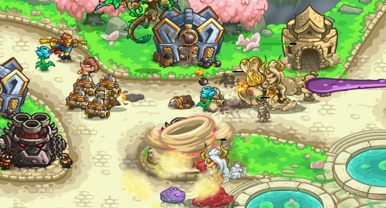 一旦当铁扇公主发现她的侍卫奈何不了联盟军,恼羞成怒的她将亲自下场。可不要小看她那芭蕉扇,只需扇一扇就可出现大量泥土士兵和本体分身,还会将我方防御塔作为兵营使用,且分身作为BOSS单位放走一个都会导致游戏结束。