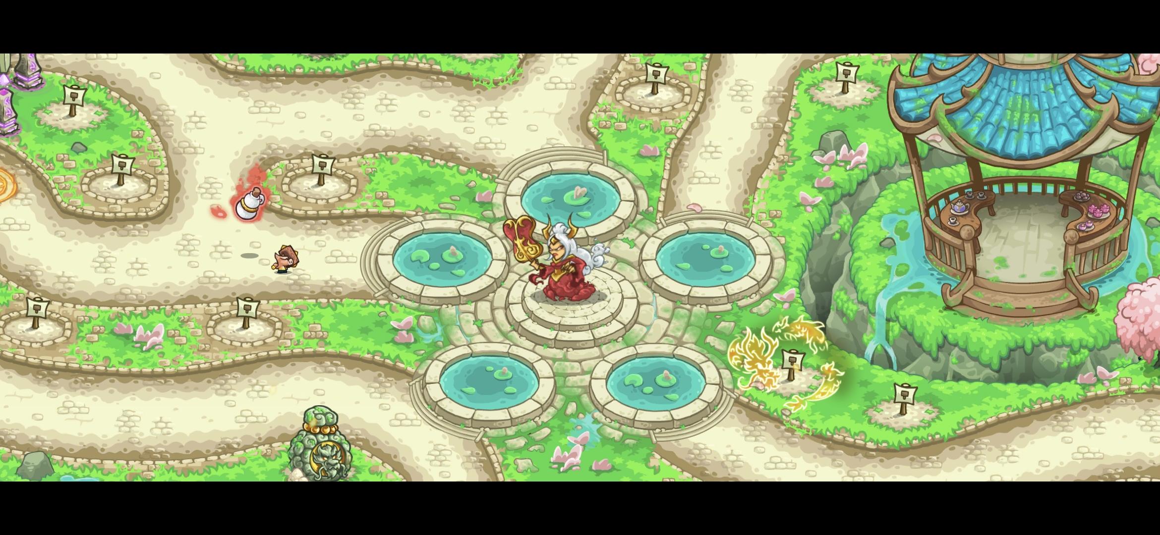 铁扇公主正端详地坐在厅中喝茶,对于我们这些来客则放出了她的专属宫廷护卫做接待。护卫们唯公主之命是从,而公主本人每当指挥官松弛之时,就会放出紫金红葫芦将没有注意到的英雄们收入壶中封印。对于这些敌人也得万般注意,经过泉眼的敌人可能从任何地方出现,并且每一波都有可能改变路径。