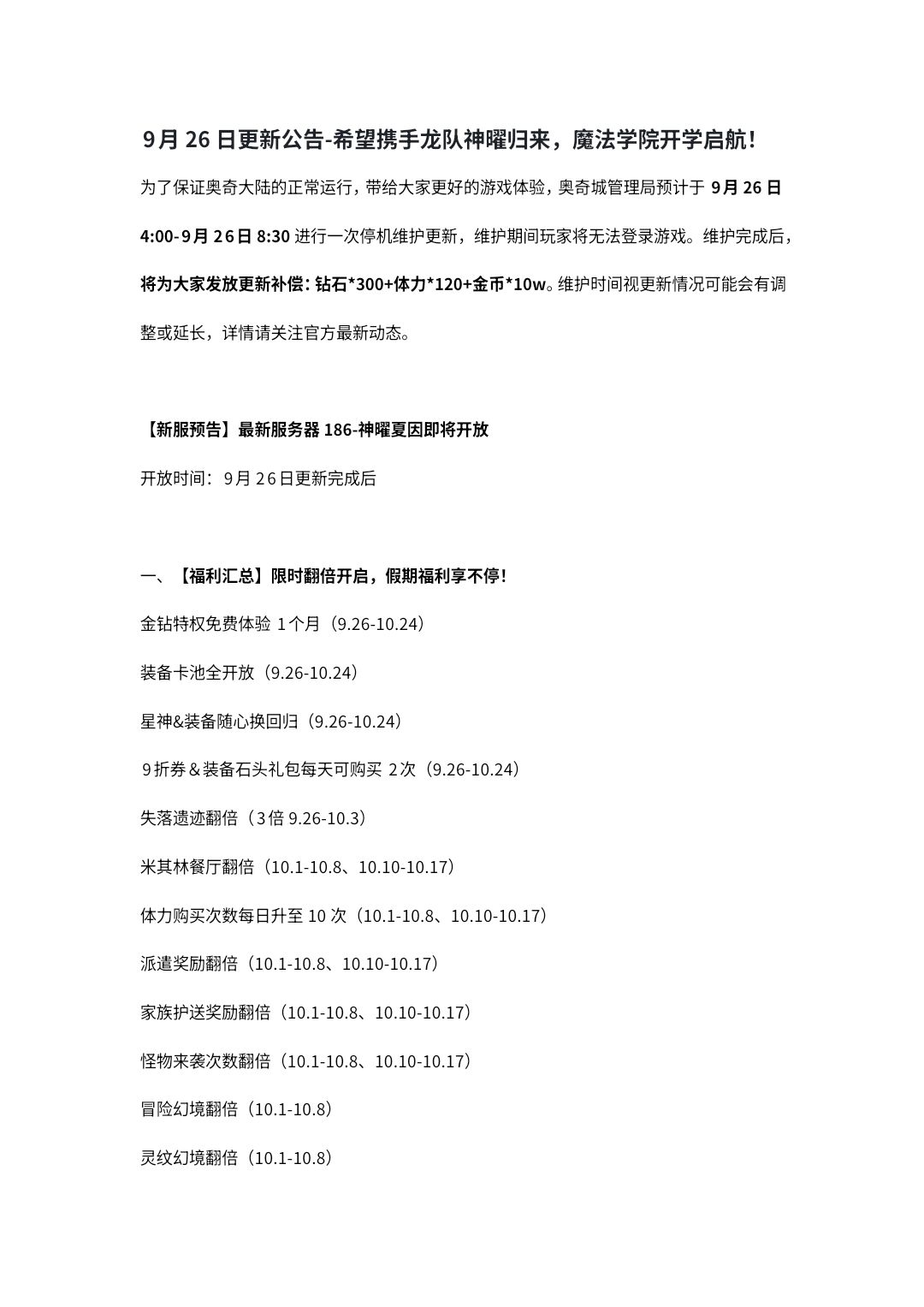 9月26日更新公告-希望携手龙队神曜归来,魔法学院开学启航!