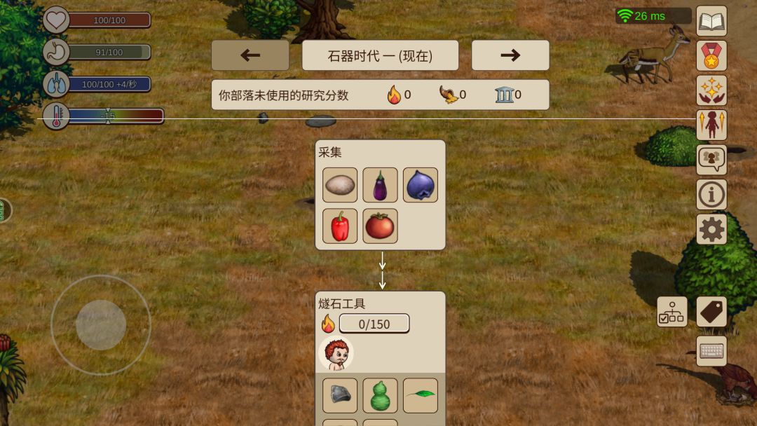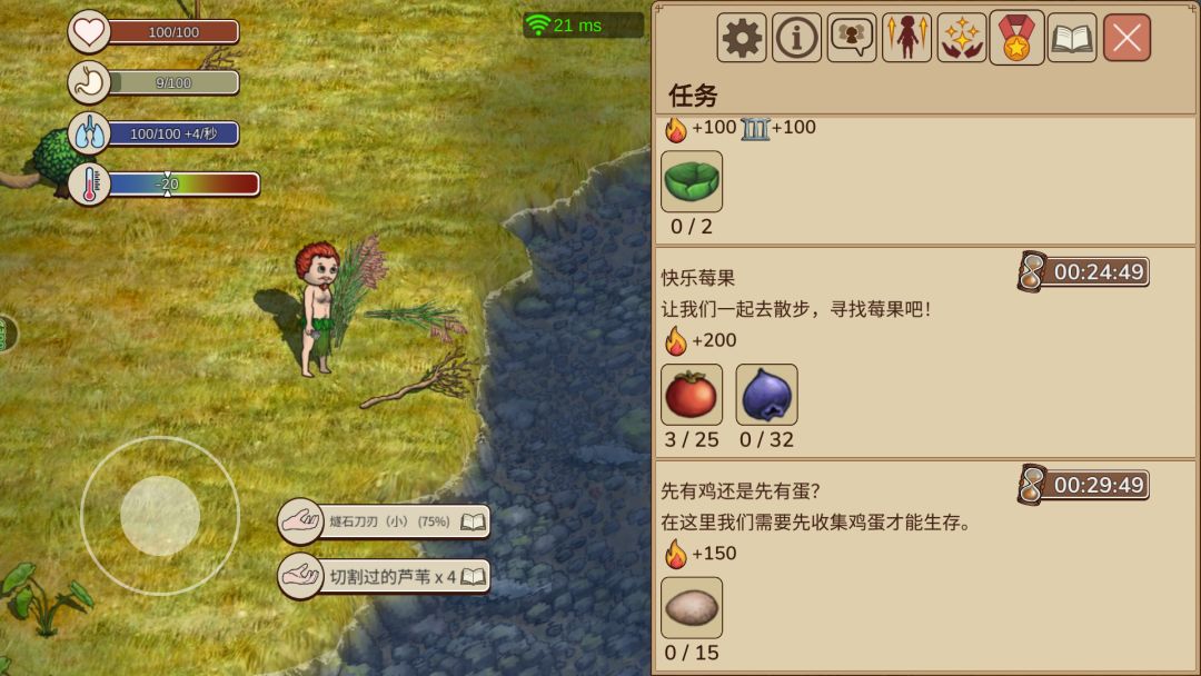 新手村民刚开始可以通过采集获取生存点数,以此解锁第一个实用工具——燧石刀刃