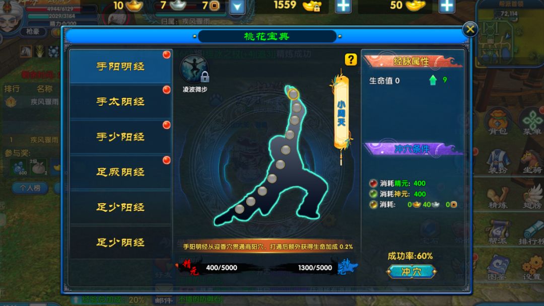 桃花宝典系统50级开放,通过消耗神元与精元打通6条经脉,全经脉达标可解锁轻功凌波微步,活跃任务与帮派玩法提供养成资源,每10级提升存储上限1000点,促进长期成长。