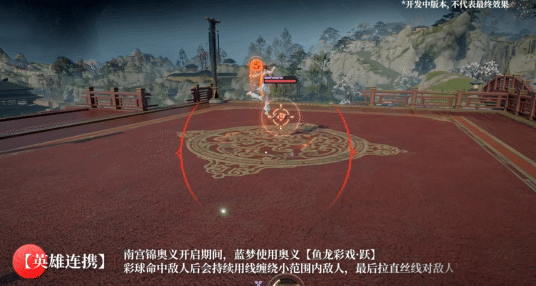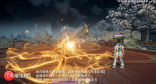 南宫锦奥义开启期间,蓝梦使用奥义【鱼龙彩戏】,彩球命中敌人会有丝线连接彩球和敌人,彩球飞行一段时间后敌人会被丝线拖拽击飞。