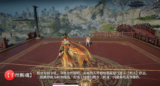 南宫锦拔出发间金针,身披金丝锦缎,击退敌人并持续消耗怒气进入【织天】状态。